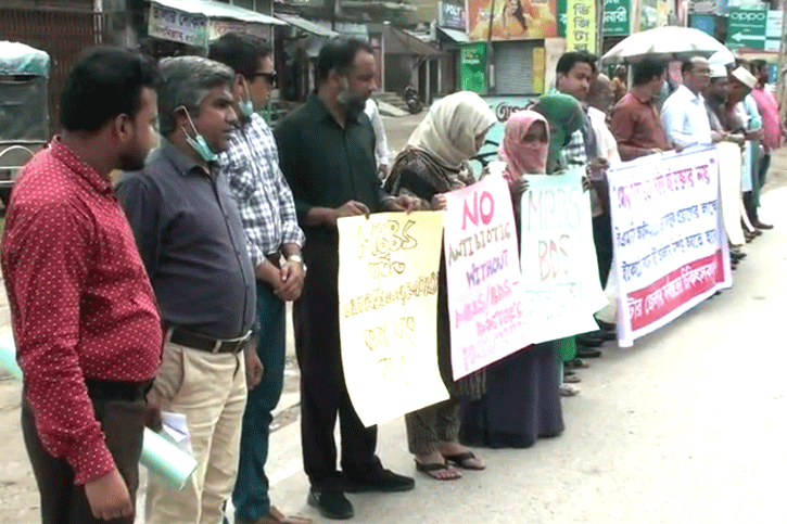 গণমুখী স্বাস্থ্য ব্যবস্থা প্রতিষ্ঠা সহ বিএমডিসি আইন-২০১০ বাস্তবায়নের দাবীতে নাটোরে অবস্থান কর্মসুচী পালন করেছেন চিকিৎসকরা। আজ বুধবার সকাল ১০টার দিকে নাটোর প্রেসক্লাব চত্বরে এই অবস্থান কর্মসুচী পালন করা হয়েছে। জেলার সকল চিকিৎসকদের সমন্বয়ে গঠিত কর্মসুচী বাস্তবায়ন কমিটির ব্যানারে জেলার চিকিৎসকরা এই কর্মসুচীতে অংশ নেন। এসময় বক্তব্য রাখেন ডাঃ মোঃ রাসেল,ডাঃ আমিনুল ইসলাম,ডাঃ আনিসুজ্জামান,ডাঃ আকলিমা বেগম প্রমুখ। বক্তারা বলেন এমবিবিএস/বিডিএস ব্যতীত কেউ ডাক্তার নয়। এখন গ্রাম্য চিকিৎসকসহ ঔষধের দোকানীরাও নিজেদের নামের আগে ডাক্তার লিখে অপচিকিৎসা চালিয়ে যাচ্ছেন। বক্তারা অপচিকিৎসা রোধে সিভিল সার্জনদের ম্যাজিষ্ট্রেসি ক্ষমতা অপর্নের দাবি জানান। এছাড়া ডাক্তার ছাড়া আলট্রাসনোগ্রাফি না করার দাবিও জানানো হয়েছে।