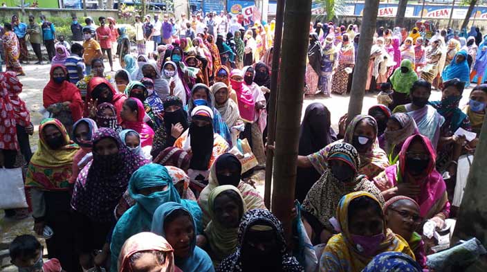 নাটোর শহরের মাহারাজা জে এন স্কুল এন্ড কলেজে সামাজিক দুরুত্ব ভেঙ্গে চান কিনতে দেখা গেছে শতশত মানুষকে। বিশেষ খাদ্য সহায়তার এই চাল দ্রুত ফুরিয়ে যাবার শঙকায় গাদাগাদি করে লাইনে লাড়িয়ে চাল কিনছে সাধারণ মানুষ। নিয়ম না মেনে এভাবেই নিজেদের বিপদকে আমন্ত্রণ জানাচ্ছে মানুষ।