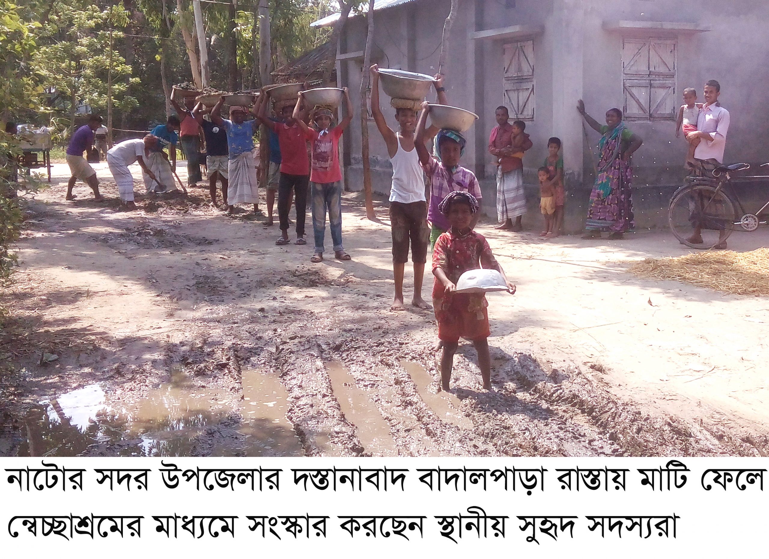 করোনা ভাইরাসের কারনে দেশব্যাপী লকডাউনের কারনে স্থানীয়ভাবে সকল উন্নয়ন কাজ বন্ধ থাকায় ওই রাস্তা দিয়ে স্থানীয়দের চলাচলে দুর্ভোগ পোহাতে হচ্ছিল। এঅবস্থায় এলাকার সুহৃদ সদস্যরা নাটোর সুহৃদ সমাবেশের সদস্য সচিব মাহতাব আলীর নেতৃত্বে স্থানীয় ইউপি চেয়ারম্যানের সহযোগীতায় স্বেচ্ছাশ্রমের মাধ্যমে রাস্থায় মাটি ফেলে সংস্কারের মাধ্যমে রাস্তাটি চলাচলের উপযোগী করে তোলেন।