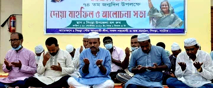 নাটোরের সিংড়ায় প্রধানমন্ত্রী শেখ হাসিনার ৭৪তম জন্মদিনে দোয়া মাহফিল ও আলোচনা সভা করেছে পৌর আওয়ামীলীগ। সোমবার বিকেলে উপজেলা পরিষদ হলরুমে আলোচনা সভা ও দোয়া মাহফিল অনুষ্ঠিত হয়।